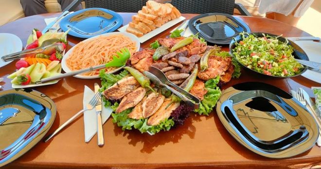 Öğle Yemeği: Tavuk, balık, köfte, makarna, salata ve meyveden oluşan açık büfe. 🍖