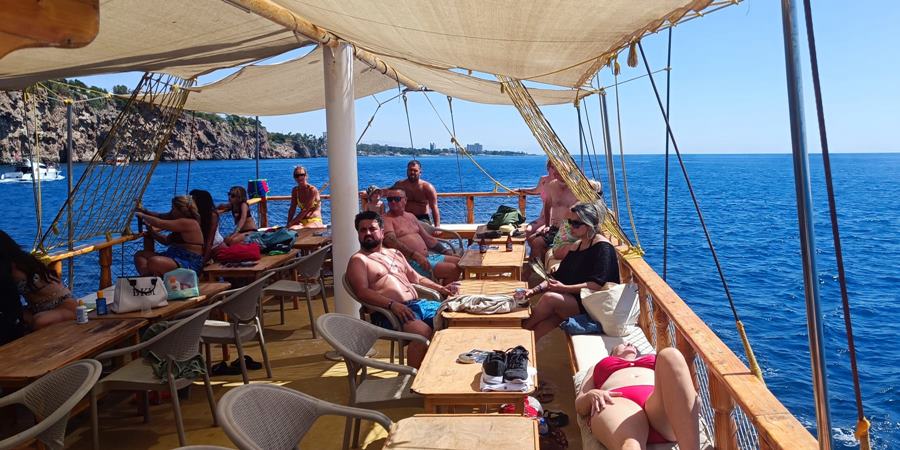 İki katlı Türk guletine (120 kişilik kapasite) binin ve saat 10:00'da yelken açın. Akdeniz kıyılarında yelken açarak Antalya'nın Eski Şehri'ni, yemyeşil kayalıkları ve masmavi suları görün. Rahat koltuklarda dinlenin veya güvertede güneşlenin. 🌊