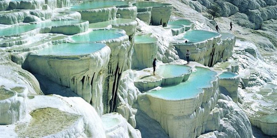 Çarpıcı Manzaralar: Mineral açısından zengin termal sular tarafından oluşturulan Pamukkale'nin ikonik beyaz traverten teraslarında yürüyün. 🏖️